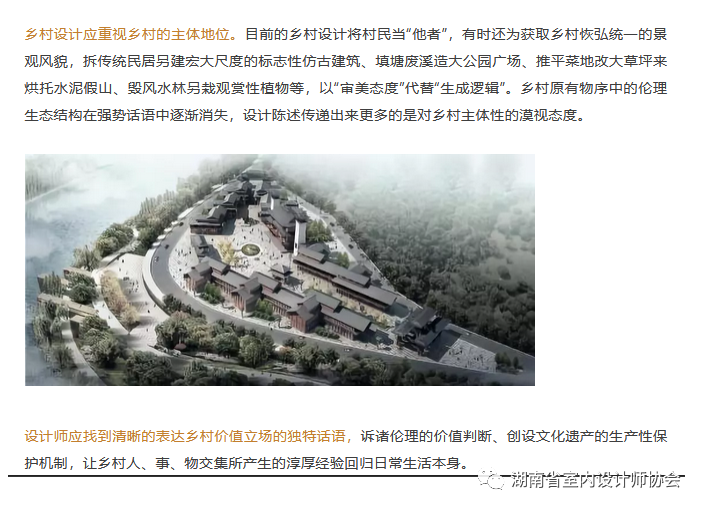 乡村不是低等级的低密度“城市”!乡村设计是关乎乡村价值再发现与认同的“系统设计”。乡村设计应敬畏地域文化价值、应尊重农民与农业的主体地位。目前我国的乡村正成为法国学者德波曾批评的“都市异化空间布展”的乡村版,没有意识到乡村是与城市等值、互补、共生的不可替代的价值体系。